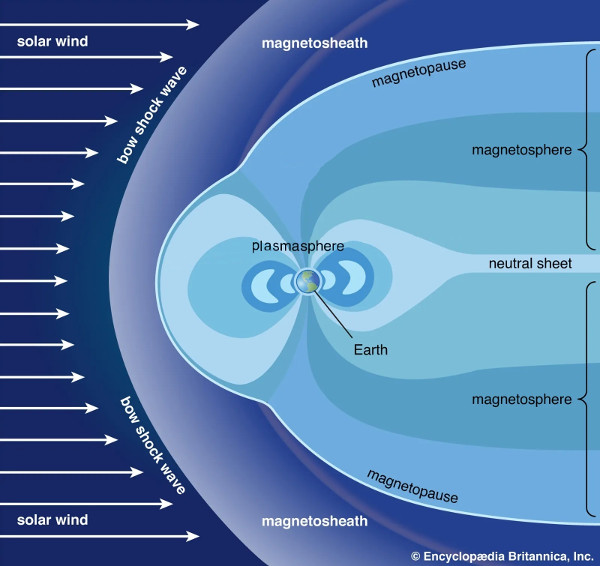 1. ábra: A napszél (solar wind) mágneses tere a Föld mágneses terébe ütközve eltérül. A létrejövő lökéshullámom (bow shock wave) áthaladva lelassul, felhevül, sűrűsége és a belefagyott mágneses tér nagysága megnő. Ezt a Föld mágneses terét (a magnetoszférát / magnetosphere) körbeáramló tartományt mágneses buroknak (magnetosheath) nevezzük. A mágnes burkot és a magnetoszférát a magnetopauza (magnetopause) választja el egymástól. A magnetoszféra legbelső, a Föld mágneses terével együtt forgó tartományát plazmaszférának nevezzük. (Kép: Encyclopaedia Britannica, Inc., módosítva)