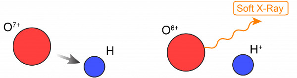 3. ábra: A töltéscsere folyamatának vázlata. A napszélben található hétszeresen ionizált, azaz hét elektronját elvesztett oxigén atom (azaz oxigén ion) kölcsönhat a Földi exoszféra semleges hidrogénatomjával. A hidrogén atom ionizálódik, elveszti az egyetlen elektronját, az oxigén ion pedig csak hatszorosan ionizált, energiafelesleggel rendelkező (gerjesztett) ion lesz. Az energiafeleslegtől pedig egy lágy röntgentartományba eső foton kisbocsátásával szabadul meg. (Kép: Boston University)
