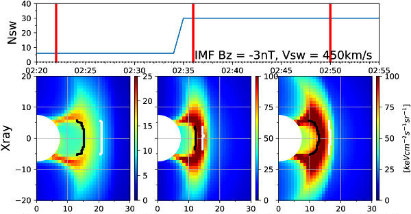 4. ábra: Lágy röntgen képek egy olyan esemény során, amikor a napszél nyomása megnövekszik. Fent: napszél (VSW)/bolygóközi mágneses tér (Bz) viszonyok a szimuláció ideje alatt. Lent: számított lágy röntgen képek, a felső ábrán található függőleges vörös vonalak időpontjaiban. A fekete görbe a magnetopauza, a fehér görbe a lökéshullám helyzetét mutatja a szimulációból számolva. A vízszintes és függőleges tengelyek az ábrán azimutot és magasságot jelentenek. (Connor és mts., 2021 cikke nyomán)