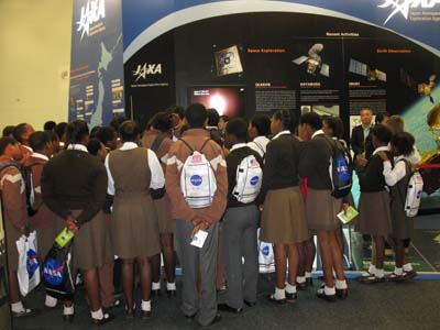 Helyi iskoláscsoport a japán űrügynökség standjánál