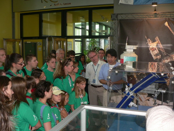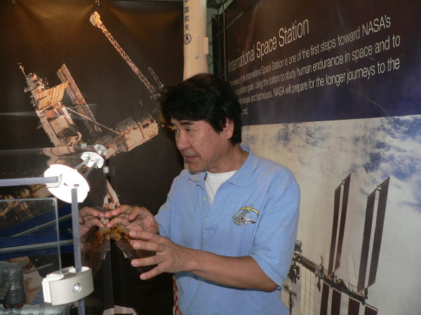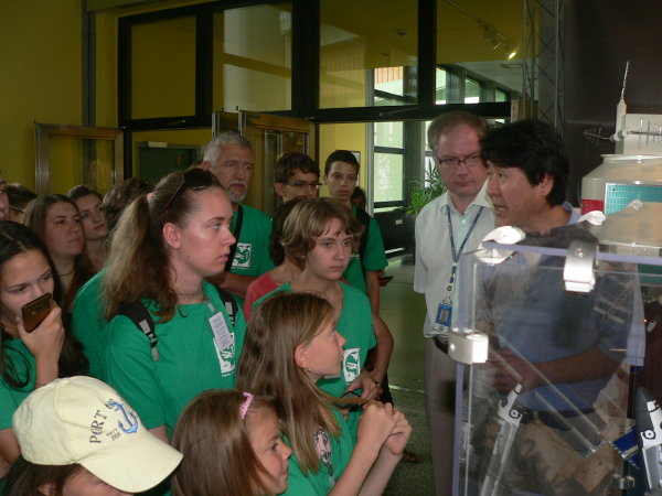 Takao Doi a Nemzetközi Űrállomásról magyaráz az űrtáborozó diákoknak, szavait a mellette álló, erdélyi Czárán Lóránt, az OOSA munkatársa tolmácsolta.