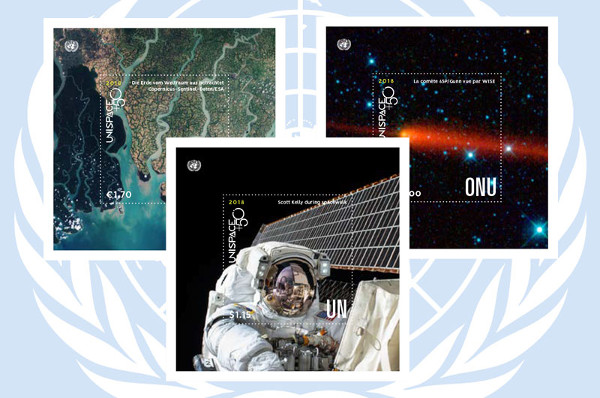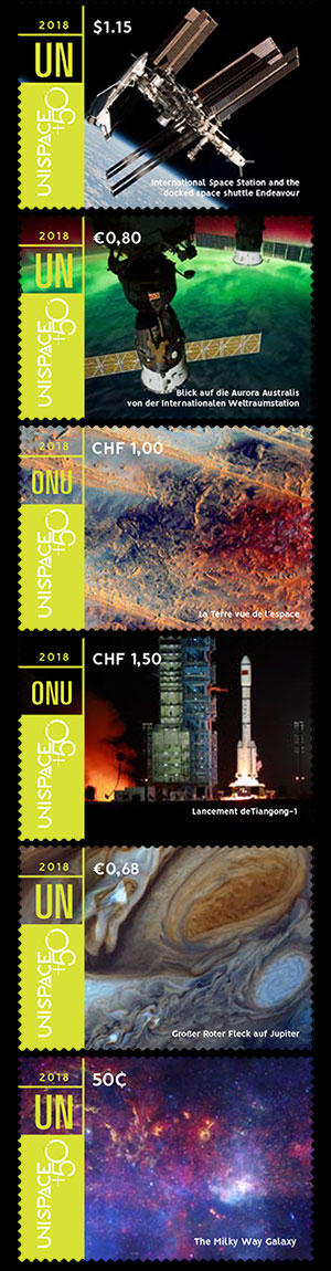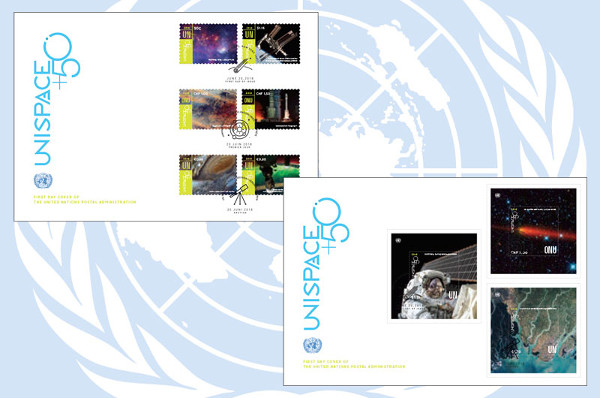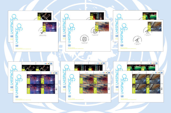 Az ENSZ Postaszolgálata (UNPA, United Nations Postal Administration) az évforduló alkalmából június 20-án, a UNISPACE+50 megemlékezés napján Genfben, New York-ban és Bécsben egyszerre űrkutatási témájú bélyegeket jelentet meg. Az ENSZ három székhelyének megfelelően a bélyegek az ENSZ szokásos gyakorlata szerint amerikai dollárban, svájci frankban és euróban megadott címletekkel jelennek meg. A bélyegek az űrrepülés, az űrtechnika, a földmegfigyelés és a távoli világűr meghódítása egy-egy eredményét ábrázolják. A 35 × 50 mm-es bélyegeket 20 darabos íveken jelentetik meg.