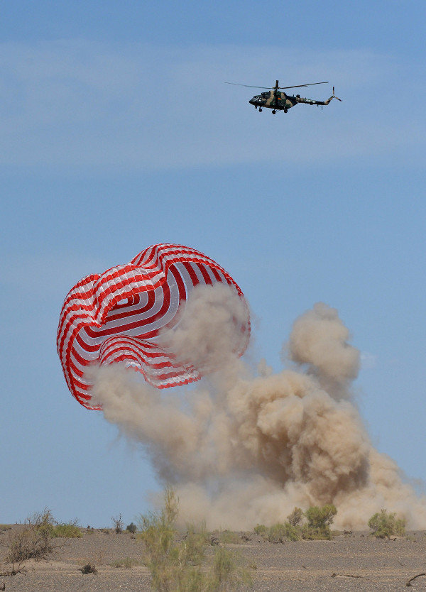 A Sencsou-12 érkezésének egy látványos pillanata. A talajt érés előtt bekapcsolt fékezőrakéta füstje összekeveredik a felvert sivatagi homokkal, miközben a fékernyő már elkezd összeomlani. A felvételt készítő tudósító addigra már a földön, miközben egy másik kutató-mentő helikopter is érkezik.