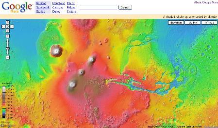A Google Mars oldal március 13-án indult. A jelenleg is a bolygó körül dolgozó Mars Odyssey THEMIS (Thermal Emission Imaging System) képalkotó műszere összesen 15 látható és infravörös hullámhosszon működik. Az Arizonai Állami Egyetem kutatóinak segítségével ezeket a felvételeket dolgozták össze egy egységes rendszerbe. Így mostantól bárki a saját számítógépének képernyőjén barangolhat a Mars felszínén. A színkódolt magassági adatok (ld. a lenti képet) illetve a látható fény tartományában készült felvételek a NASA Mars Global Surveyor szondáját dícsérik. A program kérésre megjelöli a például a nevezetes felszíni alakzatokat vagy Marsot eddig elért leszálló egységek helyét. Kellemes felfedezőutakat!