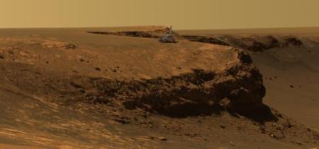 Amint a napokban mi is beszámoltunk róla, az Opportunity a Victoria-kráter mellé érkezett. Az alábbi marsi tájképre a marsjárót is rámontírozták – valahogy így festene a kráter peremén álló űreszköz, ha a közelben állva nézhetnénk. A méretarányok nagyjából helyesek.