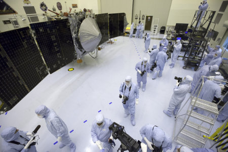 Az újságírók szeptember 27-én, még a leállás előtt vethettek egy utolsó pillantást a hamarosan a Mars felé indítandó MAVEN-re. (Kép: NASA / Kim Shiflett)