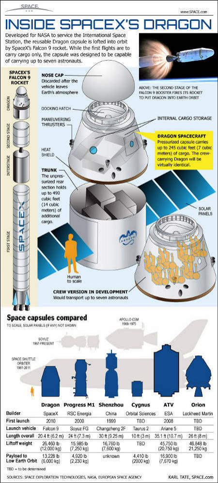 A Dragon űrhajó belseje, illetve méreteinek összehasonlítása más korábbi és jelenleg is szolgálatban levő űrjárművekéivel. (Kép: Karl Tate / Space.com) Kapcsolódó cikkek: Kapcsolódó linkek: