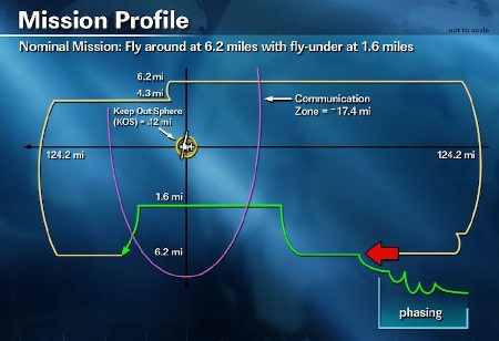 A Dragon május 24-ei megközelítési és körberepülési tesztjének vázlata. A távolságok mérföldben vannak megadva. Az átszámításhoz: 1 mérföld kb. 1,6 km. (Kép: NASA)